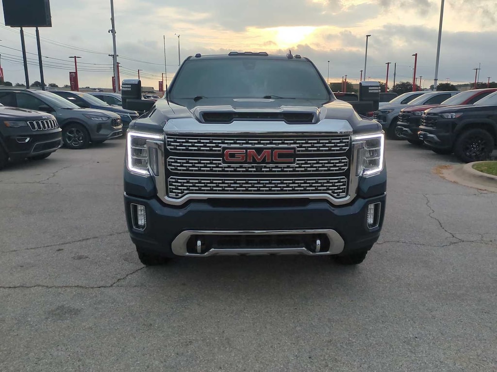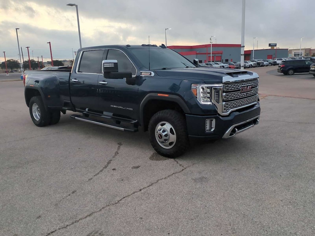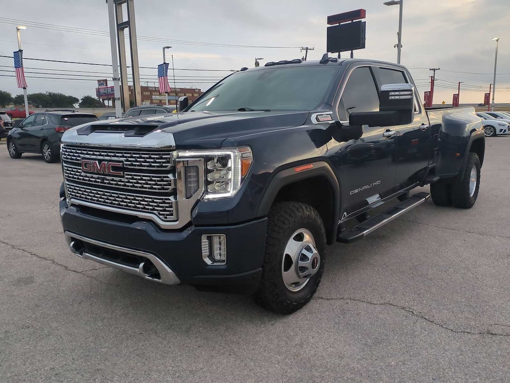 ENGINE, DURAMAX 6.6L TURBO-DIESEL V8, B20-DIESEL COMPATIBLE (445 hp [332 kW] @ 2800 rpm, 910 lb-ft of torque [1220 Nm] @ 1600 rpm) (Includes (K05) engine block heater.), TECHNOLOGY PACKAGE includes (DRZ) Rear Camera Mirror and (UV6) Multi-color 15" Diagonal Head-Up Display, GOOSENECK / 5TH WHEEL PREP PACKAGE -- Hitch platform to accept Gooseneck or 5th Wheel hitch. Includes hitch platform with tray to accept ball, stamped bed holes with removable caps installed and bed mounted 7-pin trailer harness (similar to UY2 harness). GVWR, 14,000 LBS. (6350 KG) WITH DUAL REAR WHEELS, AUDIO SYSTEM, PREMIUM GMC INFOTAINMENT SYSTEM WITH NAVIGATION AND 8" DIAGONAL COLOR TOUCH-SCREEN includes multi-touch display, AM/FM stereo, Bluetooth® streaming audio for music and most phones; featuring wireless Android Auto® and Apple CarPlay® capability for compatible phones, advanced voice recognition, in-vehicle apps, personalized profiles for infotainment and vehicle settings. Includes greater memory. (STD) (Includes (PZ8) Hitch Guidance with hitch view.), SEATS, HEATED SECOND ROW OUTBOARD SEATS (Standard on models built before 7-26-2021. Certain vehicles built on or after 7-26-2021 will include (RGJ) Not Equipped with Heated Second Row Outboard Seats, which removes (KA6) Heated Second Row Outboard Seats. See dealer for details.), TRANSMISSION, ALLISON 10-SPEED AUTOMATIC. GMC Denali with Pacific Blue Metallic exterior and Dark Walnut/Dark Ash Grey interior features a 8 Cylinder Engine with 401 HP at 5200 RPM*.